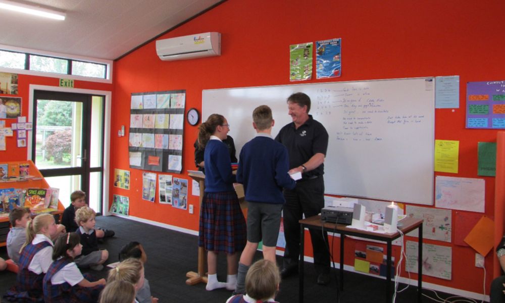 The General Manager of Oceania Dairy Ltd Roger Usmar went to local school to award prize